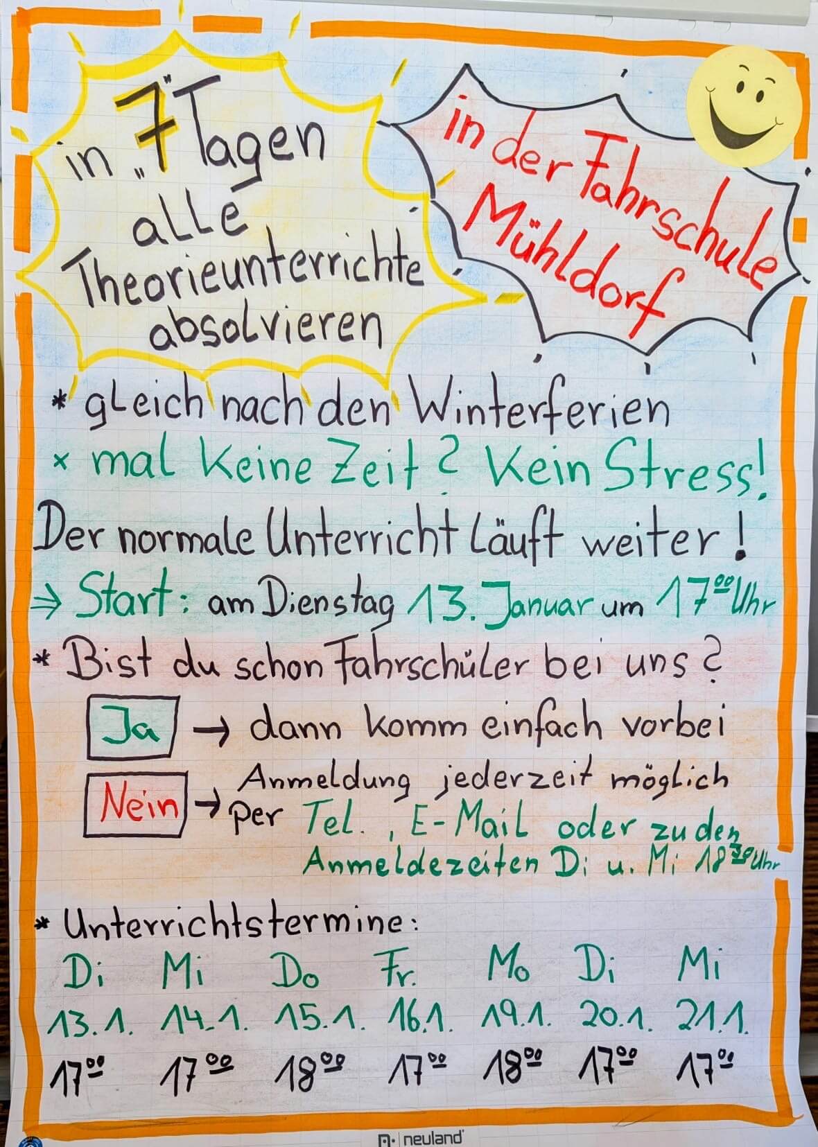 Neben dem regulären Unterricht, der zweimal pro Woche stattfindet, bieten wir regelmäßig 7-Tage-Intensivkurse für die Theoriestunden an. Diese Kurse sind ideal für Fahrschüler*innen, die sich ihr Wissen in kurzer Zeit aneignen möchten.